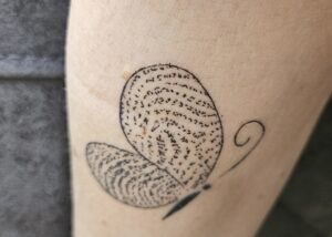 Zo ook in oktober vorig jaar bij een mevrouw in Giethoorn. Ik stuurde de afdruk naar haar dochter. Zij wilde daar een tattoo van laten zetten. Toen ik een aantal weken later bij hen kwam voor een nagesprek, liet ze mij haar tattoo zien. Het was een vlinder met daarin de vingerafdruk van haar moeder. Prachtig en zo’n mooi gebaar van liefde voor haar moeder.