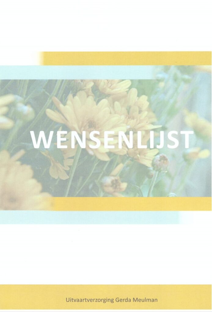 Wanneer u uw wensen kenbaar maakt, wordt het voor uw nabestaanden een beetje makkelijker in det och al moeilijke tijd, na uw overlijden. U kunt daar voor een wensenlijst invullen. Deze is aan te vragen bij Uitvaartverzorging Gerda Meulman via het contactformulier